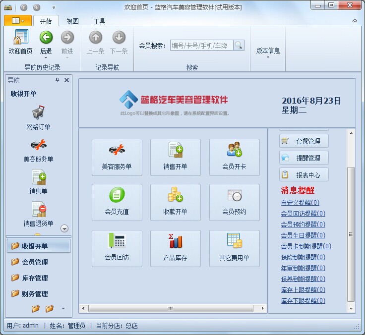 負責汽車美容快修業務,套餐產品銷售業務,管理會員開卡,同時兼具銷售退款功能,如果收款操作錯誤,只要刪除相應的收款單據,即可重新收款。