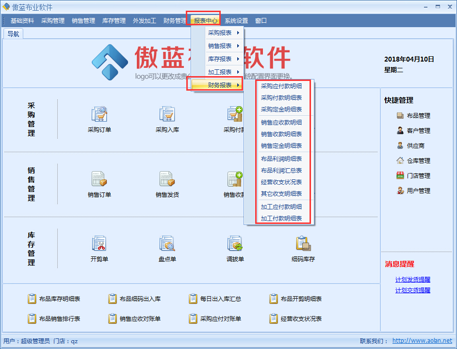 在傲藍(lán)布匹銷(xiāo)售管理軟件的財(cái)務(wù)管理模塊中做了很多財(cái)務(wù)管理的各種明細(xì)報(bào)表,比如:采購(gòu)應(yīng)付款明細(xì)、采購(gòu)付款明細(xì)表、供應(yīng)商訂金流水、銷(xiāo)售應(yīng)收款明細(xì)、銷(xiāo)售收款明細(xì)表、客戶(hù)訂金流水賬、經(jīng)營(yíng)收支狀況表、其他收支明細(xì)表、加工應(yīng)付款明細(xì)、加工付款明細(xì)表;詳細(xì)的財(cái)務(wù)報(bào)表中心,通過(guò)各個(gè)財(cái)務(wù)明細(xì)報(bào)表了解客戶(hù)或供應(yīng)商的收費(fèi)情況及店鋪經(jīng)營(yíng)的數(shù)據(jù)報(bào)表。