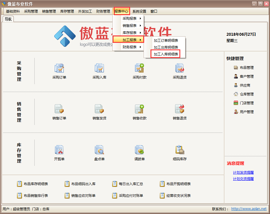 傲藍(lán)布業(yè)管理軟件如何查看加工入庫明細(xì)表(專業(yè)版)