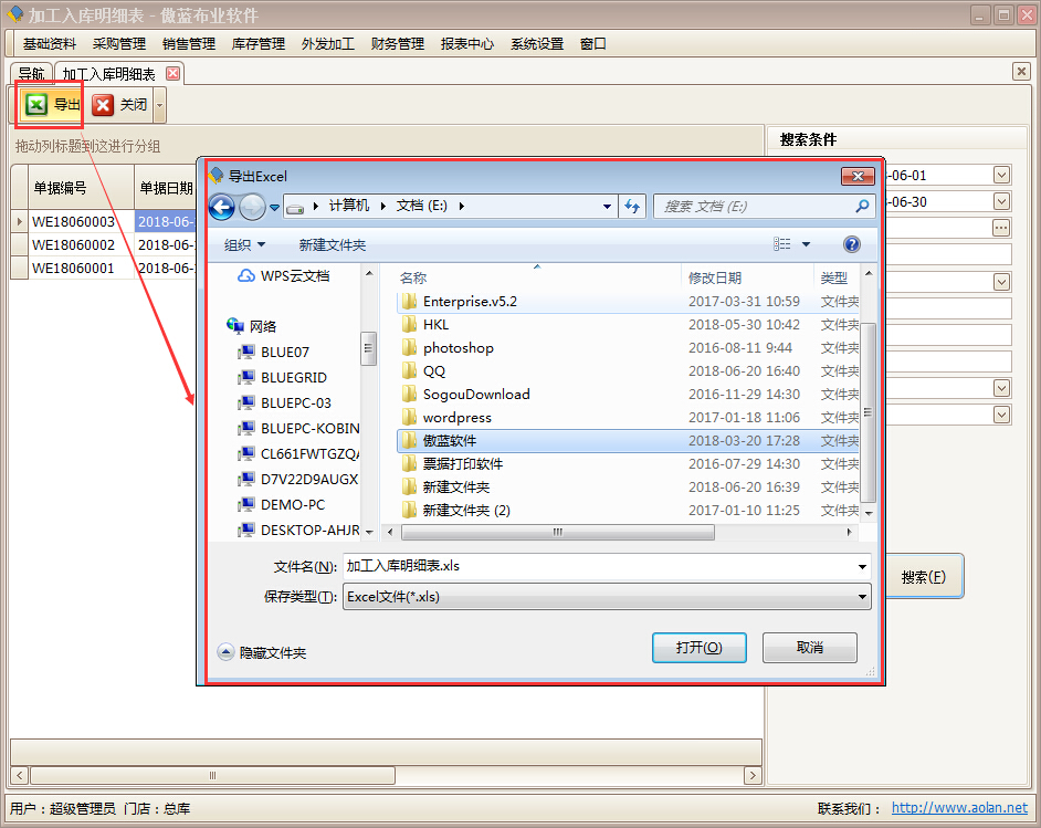 導(dǎo)出是把當(dāng)前列表中所有的記錄以 Excel 表格方式導(dǎo)出。在加工入庫明細(xì)表列表界面上,點擊【導(dǎo)出】按鈕。