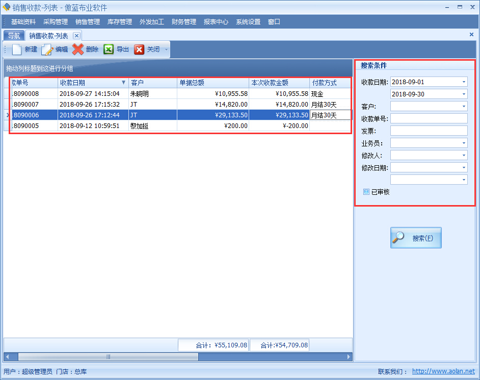 傲藍布匹銷售管理系統,銷售收款單主要是針對銷售發貨時應收的貨款,同樣,收款單也支持一次性收取多批單據費用。銷售收款單包括單據日期、客戶、付款方式、發票、銀行、收款金額等信息。明細列表中是每筆采購單的單據金額、已付金額、未付金額、扣除定金、折扣金額、實付金額等信息。