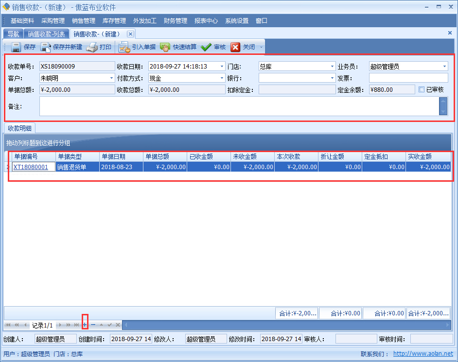 ○2 通過銷售付款列表上的【新建】按鈕進行銷售付款新建