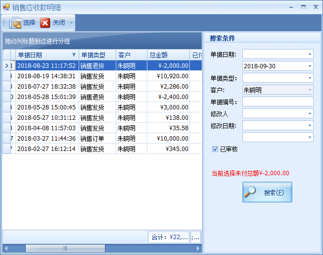 如需要對銷售付款中某一條數據進行刪除的,通過銷售付款列表界面,選中一條記錄。點擊【刪除】