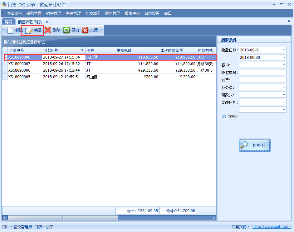 如需要對銷售付款某一條數據進行修改的,通過銷售付款列表界面,選中一條記錄。點擊【編輯】按