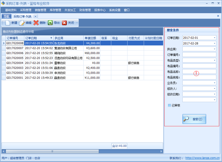 傲藍布行管理系統采購訂單管理,采購訂單主要是用于,采購時按照所需要的布品,進行登記。