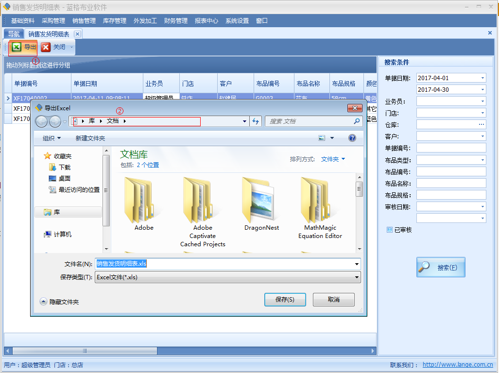 傲藍布業軟件銷售發貨明細表:記錄所有的銷售發貨記錄。在表中詳細記錄了銷售日期,業務員,門店,客戶,布品編號,布品名稱,布品規格,顏色,單價,數量,售出總價等信息。