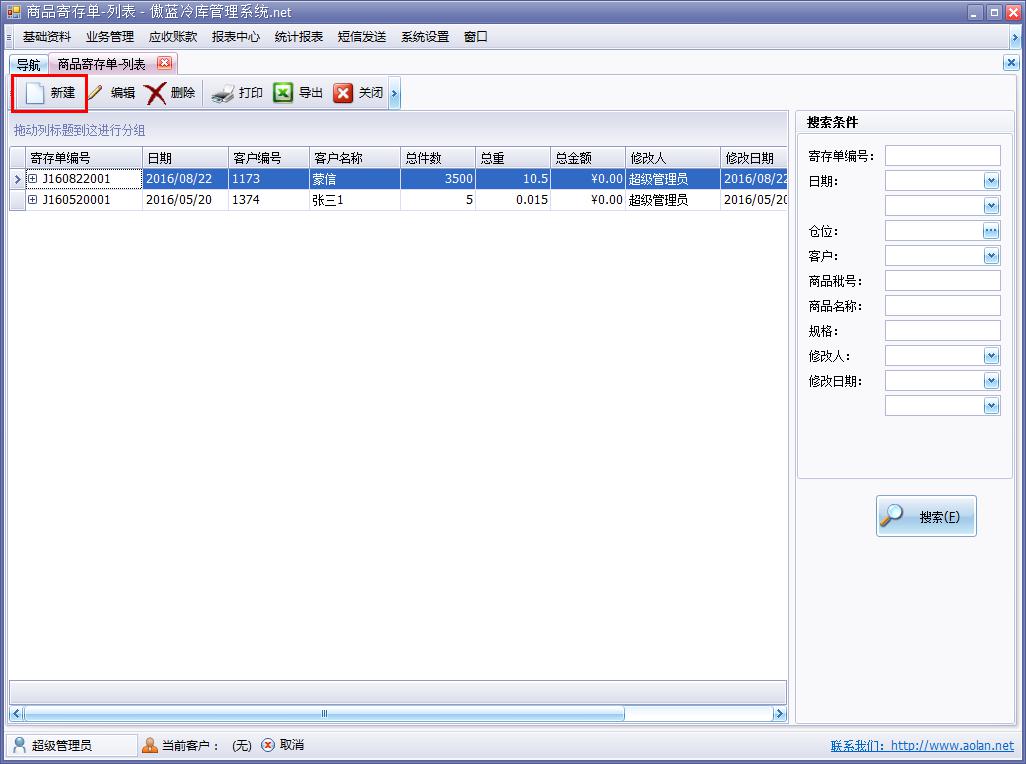 傲藍(lán)冷庫倉儲管理軟件寄存模塊即商品寄存單,界面與商品入庫單相似,冷庫倉儲管理軟件可分倉庫,按照商品批號或者商品編號進(jìn)行入庫寄存。