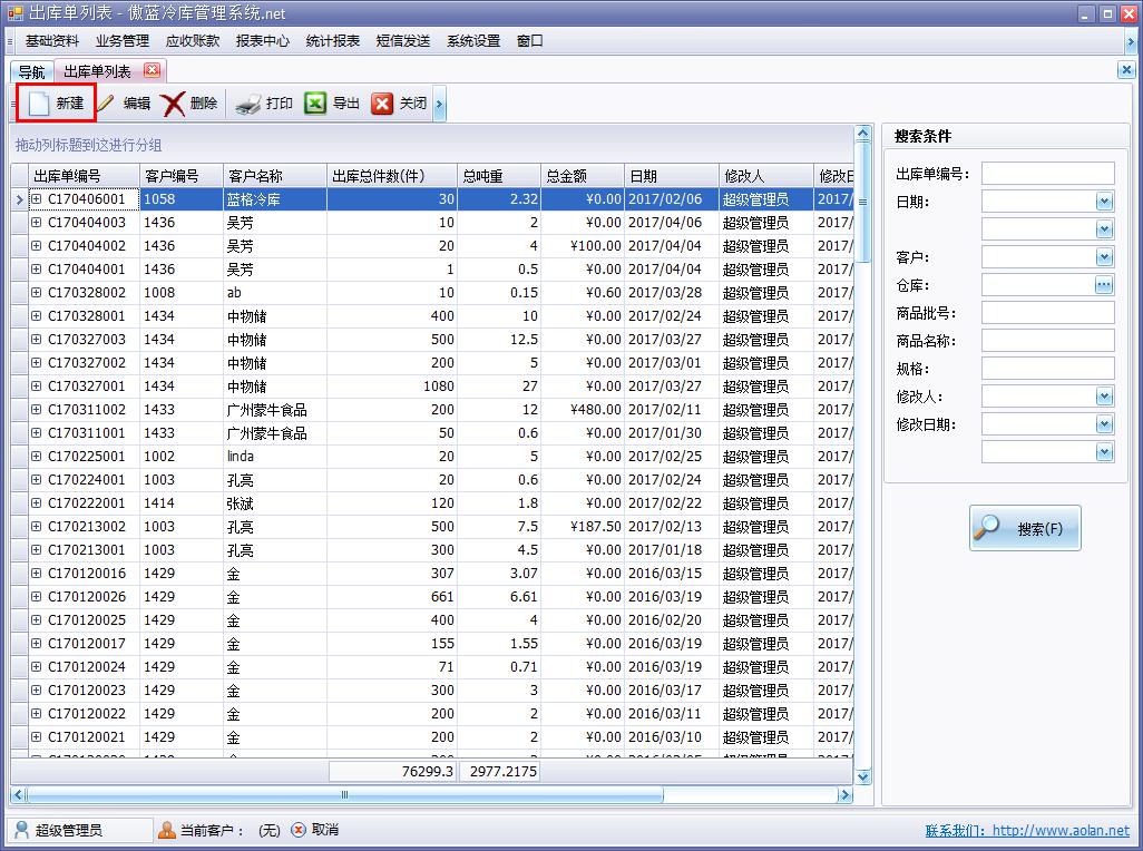 傲藍(lán)冷庫倉儲(chǔ)管理軟件,商品出庫單,對(duì)指定的商品批號(hào)或者商品編號(hào)進(jìn)行出庫,此模塊顯示當(dāng)前批號(hào)商品的存貨件數(shù)、存貨噸重,出庫的噸重不能超過存貨噸重。