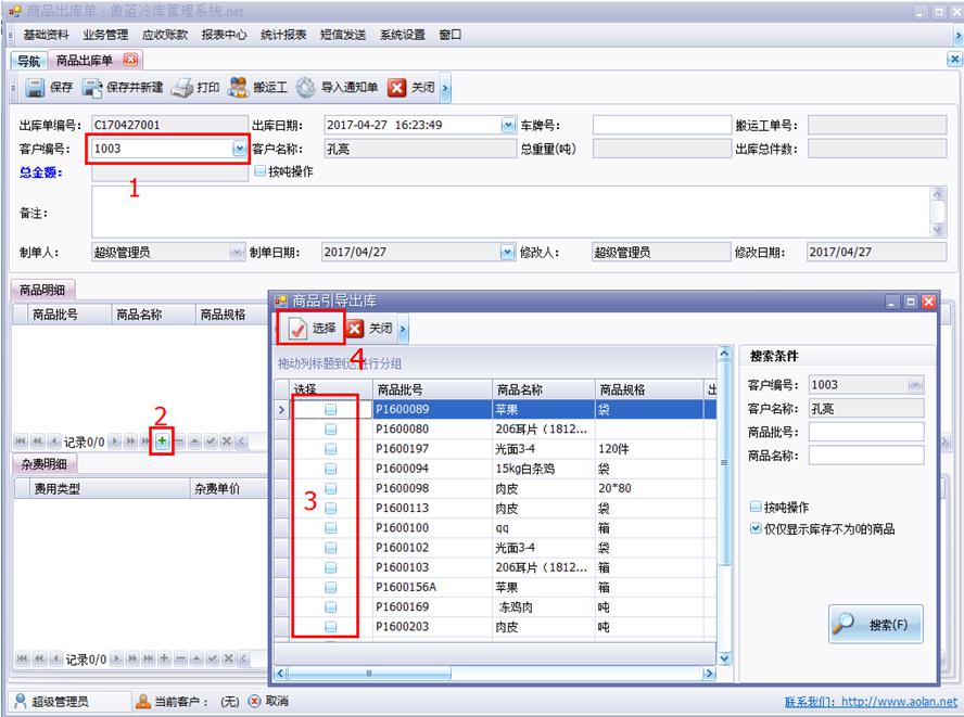 步:選擇要出庫的客戶,第二步:添加要出庫的商品,軟件會(huì)把該客戶的所有存貨記錄顯示出來,第三步:選擇要出庫的商品打上勾,第四步:點(diǎn)擊選擇即可,如圖: