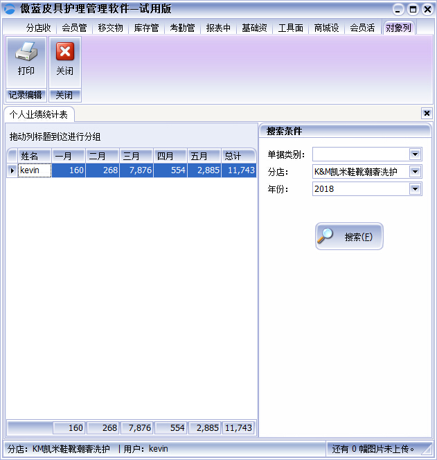 傲藍皮具護理店連鎖軟件提供個人業績統計報表功能,根據不同的業務類型以及門店,快速檢索員工的個人業績情況。