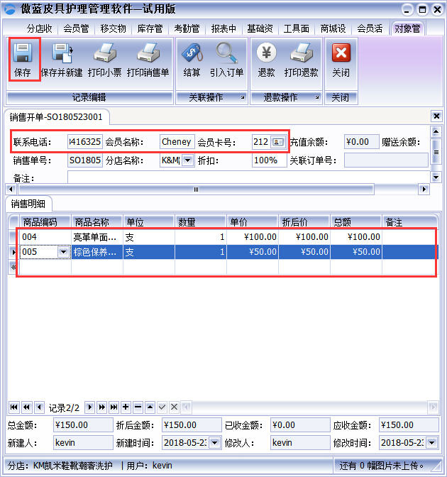 3、當商品要進行銷售時,在傲藍皮具護理店管理系統(tǒng)的【分店收銀】→【銷售開單】進行銷售產(chǎn)品,填入會員或散客的電話,選擇需要銷售的產(chǎn)品,購買的數(shù)量保存,結(jié)算并打印收銀單據(jù)即可,如圖: