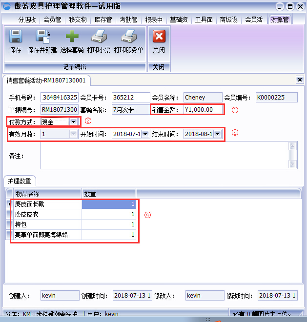傲藍皮具護理店管理軟件護理套餐的自定義設置與套餐售出的具體操作步驟如下: