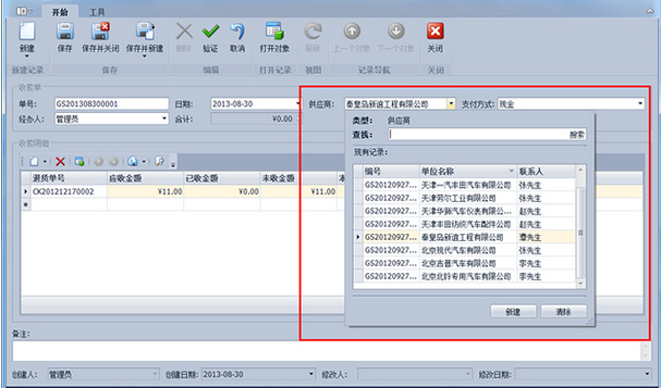 傲藍汽車維修管理系統-新建供應商退貨收款單詳細界面