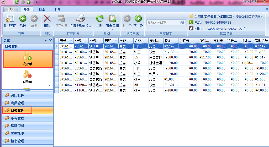 傲藍眼鏡管理軟件有多種的支付方式,如現金,銀行卡,會員卡,微信支付,支付寶支付,積分抵扣,折讓等,在財務管理,收款單里面有清晰的列出每張銷售單的支付方式和金額,方便門店查看各種支付方式的總金額。